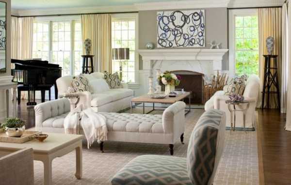 Помимо дивана в гостиной нужно разместить кресла или полукресла, пуфы и низкие скамьи для ног. Обивка – шерстяная, кожаная, жаккардовая, гобеленовая, тиковая. Не забывайте про разноцветные диванные подушки.