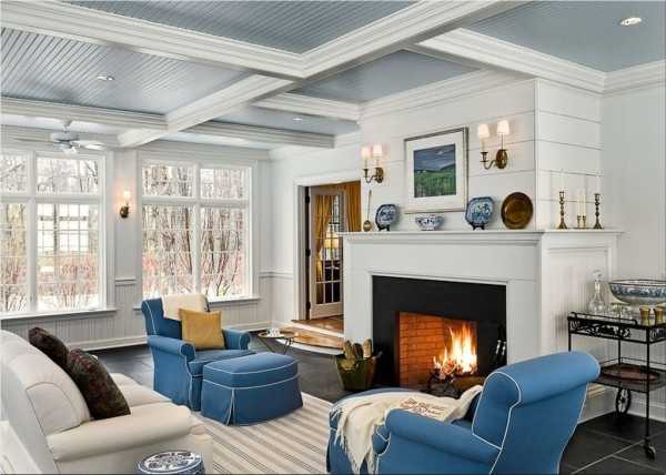 При оформлении гостиной не обойтись без интересного потолка, ведь он является одним из акцентов английского стиля. Он может содержать элементы лепнины, рельефа. Многослойность, кессоны и даже декоративные деревянные балки – все это черты британской самобытности.