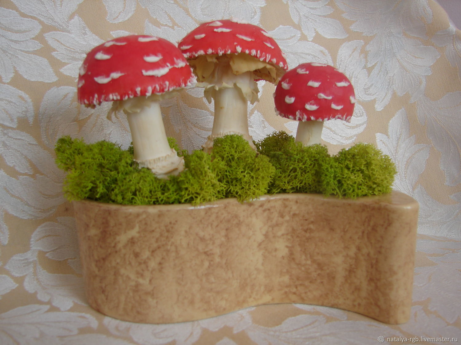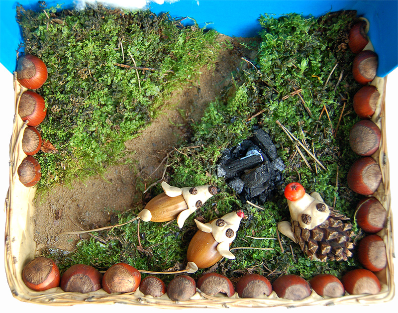 Низ поделки вы можете украсить лесным мхом. Предварительно мох нужно высушить на батарее в группе и тогда он хорошо крепится на пластилин.