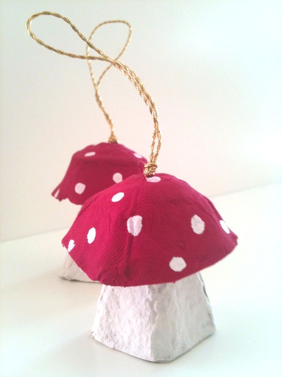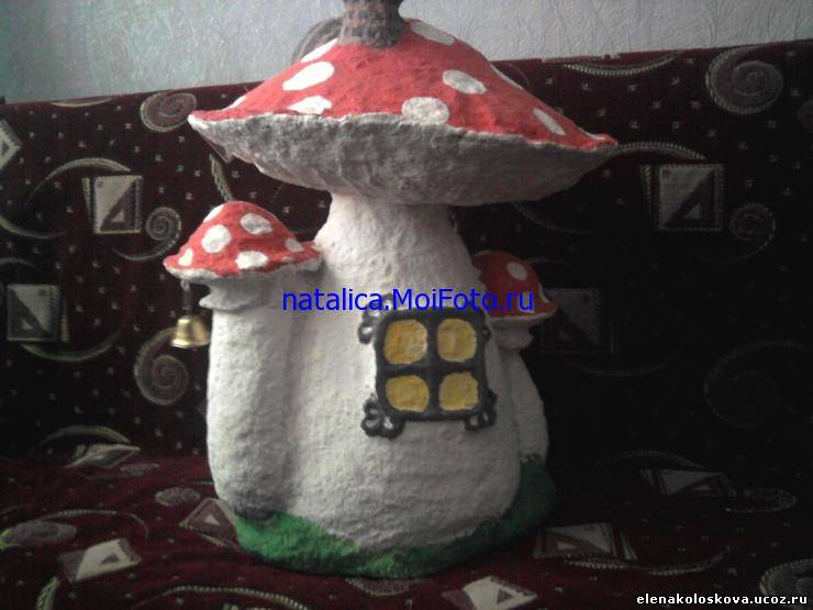 Сначала из папье-маше (бумажного теста) лепим такие грибочки. Потом сушим их и разукрашиваем специальным составом.