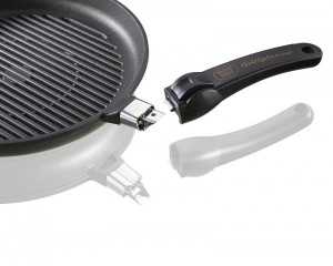 Некоторые сковороды-гриль оборудованы съемными ручками. Эти модели занимают намного меньше места в шкафу и могут применяться для приготовления блюд в духовках.