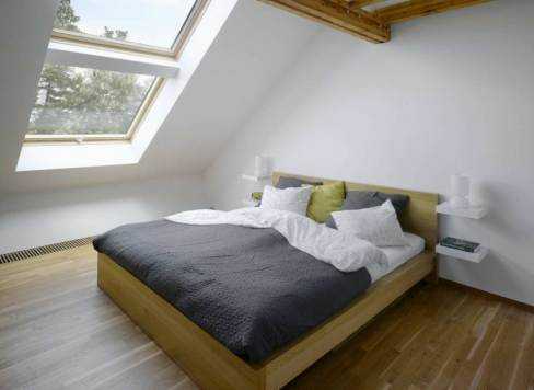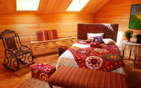 Спальня может быть устроена в небольшом чердачном помещении, но важно, чтобы в центральной части комнаты высота балки была выше человеческого роста, по краям под скатами крыши прекрасно расположатся кровати.