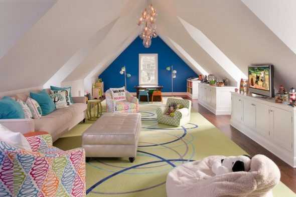 Иногда чердак становится зоной игр и отдыха не только для молодого поколения, но и для всей семьи. К примеру, если с вашего чердака открывается прекрасный вид через большие окна, — то вы можете устроить там чайную комнату с удобными диванами. Для менее освещенного пространства подойдет идея бильярдной либо домашнего кинотеатра; а если в вашем доме есть энергичные маленькие дети, то им наверняка придется по душе игровая площадка с мягким покрытием и разнообразными турниками.