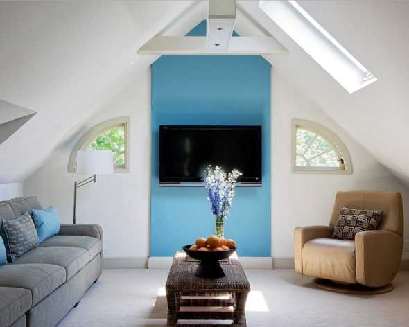 Материал отделки стен и потолка во многом зависит от общего стиля дома. Так в деревянном доме уместно будет дерево и в отделке чердака, особенно если весь дом выполнен в этом стиле. В более современном интерьере стены можно обшить гипсокартоном, затем окрасить их или оклеить обоями.