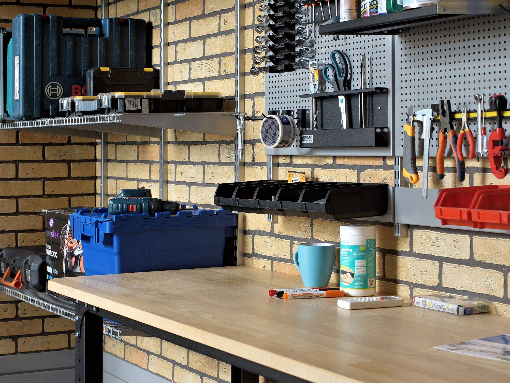 Вы можете покрыть всю стену перфорированной панелью для максимального хранения.Другой вариант — вырезать кусок перфорированной доски и вставить его в рамку, это будет выглядеть красивее, но не будет держаться так сильно. На перилах можно держать ручные инструменты, садовые инструменты и даже компоненты/детали/штуки.