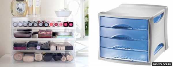 Из подручных средств также может пригодиться прозрачный органайзер для хранения офисной бумаги. Его многоэтажная компактная конструкция позволяет уместить достаточное количество косметики. При этом, её всегда удобно достать в нужный момент.