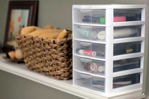 Если у вас очень много косметики, купите прозрачный органайзер для офисной бумаги. Эта полезная конструкция позволит вам рассортировать косметику по полочкам, где для каждой группы будет выделен отдельный ящичек. Прозрачность органайзера даст вам понять, в каком ящике какие средства находятся. Таким способом можно хранить большую част косметики.