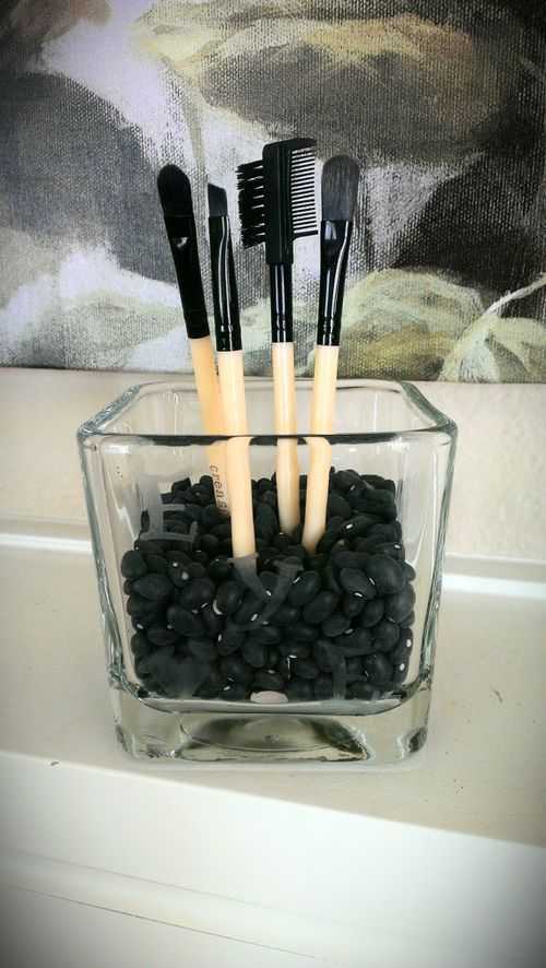 В прозрачных стаканах очень удобно хранить кисти для макияжа. Заполните их черными бобами, и кисти всегда будут в нем ровно стоять.
