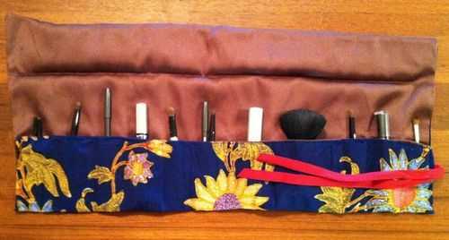Их не обязательно покупать, отличный органайзер легко сделать своими руками. Просто выберите цвет ткани, сшейте ее в форме кармашка и прошейте нужное количество отсеков для кистей, карандашей и туши.