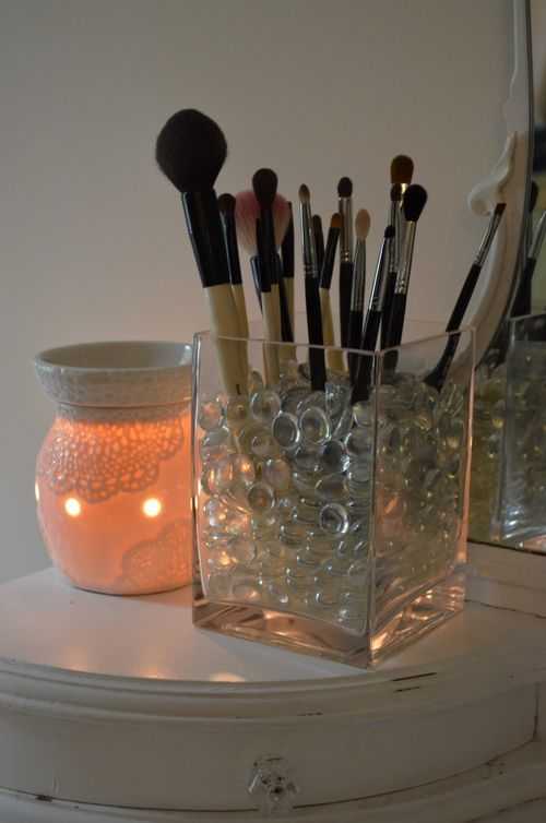 Как уже говорилось выше, кисти для макияжа лучше всего хранить вертикальном положении, так они будут храниться дольше. Помимо помещения их в обычный стакан, можно подойти к этому делу творчески, наполнить стеклянную баночку или стакан кофейными зернами или декоративными камушками. Так кисти не только будут храниться удобно, но также не соприкасаться между собой и, соответственно, не сминаться.