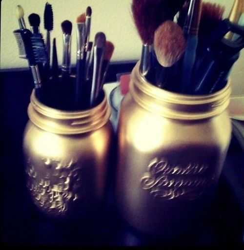 Для хранения всевозможных кисточек и карандашей для глаз и губ отлично подходят банки. Это могут быть специальные декоративные ёмкости или же просто жестяные или стеклянные тары, которые приглянулись своим интересным дизайном. При желании их можно украсить кружевами, перекрасить в любимый цвет или декорировать декупажем.