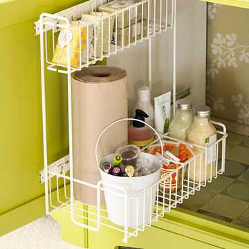 В качестве органайзеров пригодятся и разделители для хранения столовых приборов, и декоративные ведёрки.
