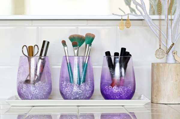 Стаканы для хранения косметики можно наполнить бисером и другими подобными вещами.