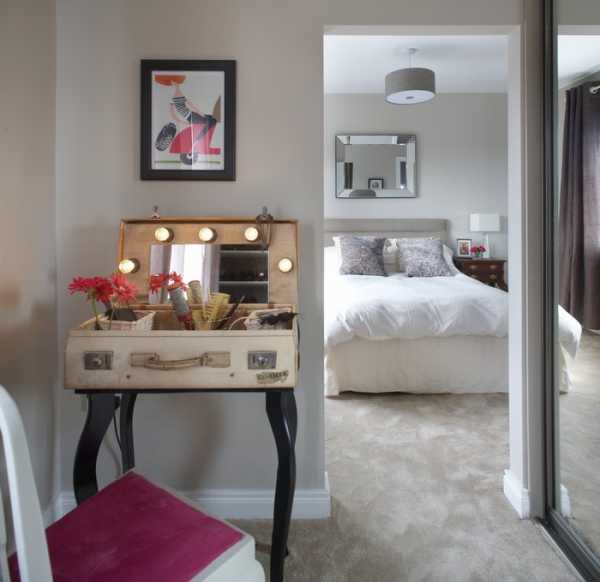 Если у вас нет туалетного столика, не беда. Сделайте его своими руками. Найдите на барахолке старый чемодан и старый стол с красивыми ножками. Столешница вам не понадобится. Отреставрируйте ножки и чемодан. Воспользуйтесь акриловыми красками или краской из баллончика. Нежные пастельные тона отлично подойдут, но все зависит от интерьера вашей комнаты. Прикрепите с помощью гвоздей (можно попросить мужа) нижнюю часть чемодана к ножкам. Внутри чемодана можно прикрепить зеркало и небольшие лампочки.