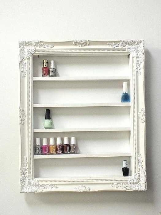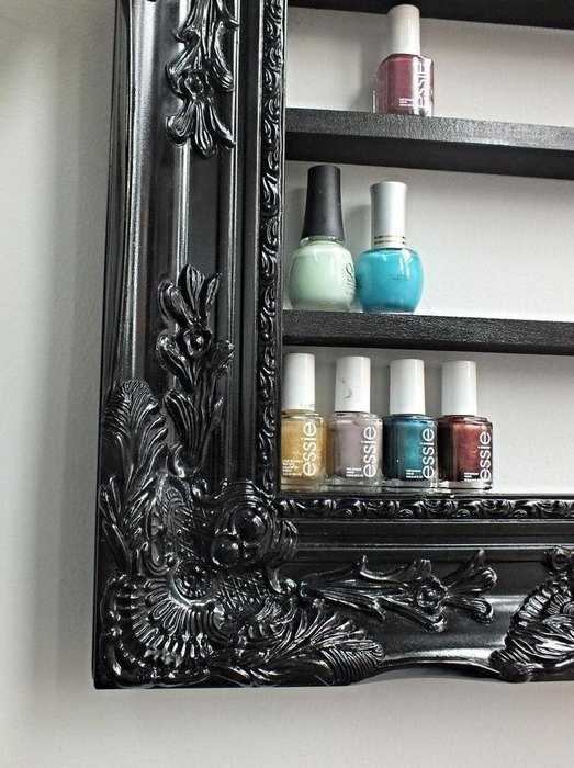 А почему бы не сделать держатель для косметики частью интерьера? Например, взять красивый багет, снабдить его несколькими узкими полочками и расставить на нём пузырьки с лаком для ногтей. При желании, его всегда можно перекрасить в любой цвет, чтобы он сочетался с другими предметами интерьера.