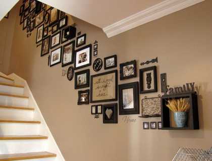 Данное решение можно реализовать также легко, как и предыдущее. Изюминкой декора из фотографий является рамка, в которую будет помещено фотоизображение. Лучше всего выбирать рамки разные по форме, а по цветовой гамме подходящие к интерьеру комнаты.