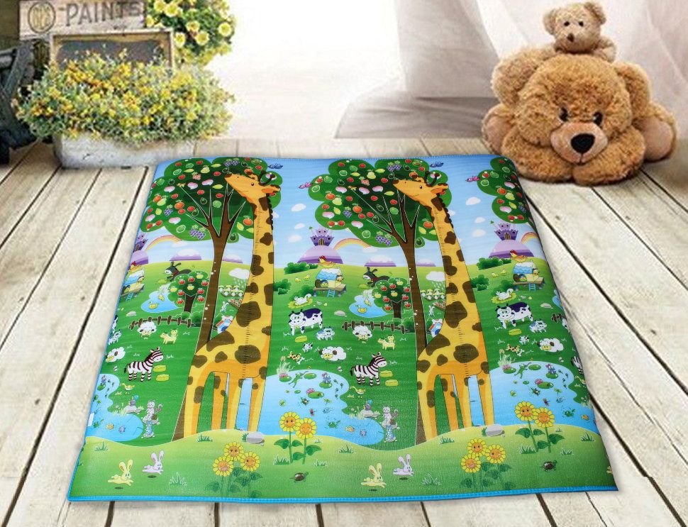 Они также утеплены внутренним слоем и прострочены. На нижней стороне имеются противоскользящие элементы. Изготовлены из безопасного полиэфирного волокна, не вызывают аллергии. Яркий рисунок нанесен цифровым методом безвредными красками, которые устойчивы к истиранию и надолго сохраняют первозданный внешний вид даже после многократных стирок. Детские игровые коврики, в отличие от традиционных ворсистых ковров, не впитывают влагу и загрязнения, не собирают пыль, в нем не затеряются мелкие предметы и мусор. По размеру прямоугольный ковер просто огромен — 195х145 см. Это отличное покрытие для детских игр на полу, теплое и мягкое. По толщине он примерно 1 см.
