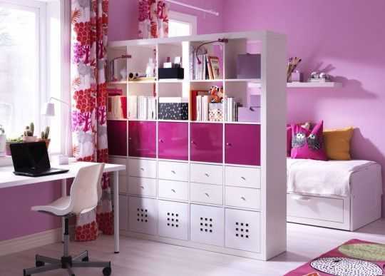 Стеллажи очень удобны в комнате для двоих детей, особенно разновозрастных. Ими можно разделить пространство на две относительно изолированные зоны, нижние секции оставить младшему ребенку под игрушки, а верхние – старшему для его вещей, чтобы малыш до них не дотянулся.