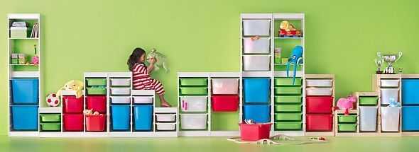 Как вариант, можно предложить систему хранения Труфаст (ИКЕА) с легкими пластиковыми контейнерами, которые ребенок сможет легко выдвигать, переносить и убирать обратно.