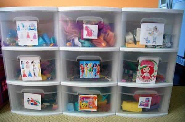 1. Лучше всего хранить игрушки в ящиках или контейнерах. С такой системой хранения порядок наводится легко и быстро. Если расставлять игрушки на полках, уборка будет занимать слишком много времени.