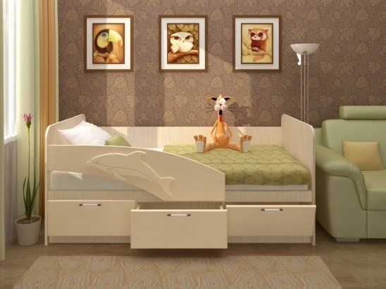 - Кровать с выдвижными ящиками. Они располагаются под спальным местом и в зависимости от его высоты могут быть очень вместительными. Хорошо, если ящиков несколько – в них можно складывать игрушки по видам.