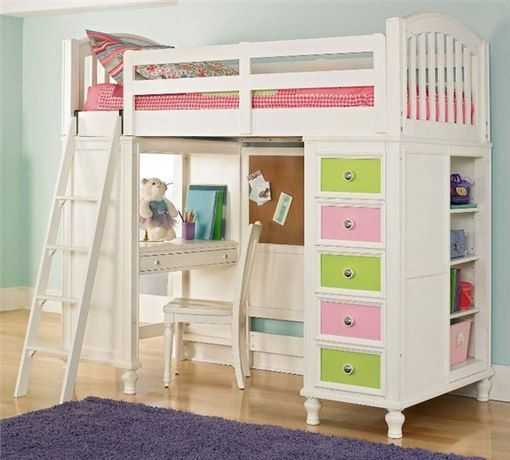 Кровать-чердак — отличное решение для небольшой детской комнаты. Спальное место для ребенка размещено на «втором этаже», а для хранения игрушек можно использовать стеллажи/полки или лестницу с модулями-ступеньками.