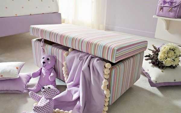 Небольшие диванчики для отдыха с откидными сиденьями и ящиками под ними – тоже могут стать вместительными местами для хранения мягких игрушек, машин, конструкторов и настольных игр. Главное – снабдить их удобными механизмами открывания, чтобы крышка не падала произвольно.