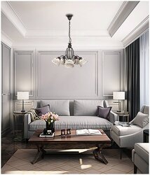 Все фото На фото: Современная классика в интерьере квартиры в ЗеленоградеДля освещения локальных зон (обеденного стола, барной стойки, диванной группы) в неоклассическом интерьере часто используются изящные пяти- или шестирожковые люстры с металлическим каркасом и текстильными плафонами. Самыми популярными являются современные модели стального цвета с красиво изогнутыми элементами и декором из кристаллов Swarovski.