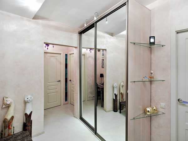 Идеальным решением станет небольшой многофункциональный зеркальный шкаф-купе. Обязательно заранее продумайте его внутреннюю архитектуру, чтобы с наибольшей выгодой использовать даже неглубокую мебель. Не плохим вариантом являются также угловые прихожие.