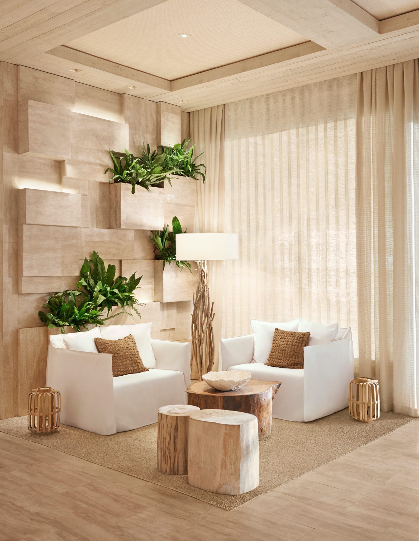 В цветовой гамме предпочтительны древесные, пастельные тона, оттенки зелени, воды, камня. В качестве основы подходят белый, молочный, песочный, градации серого, пыльно-синий, светло-голубой. Светлые природные оттенки успокаивают, формируют гармоничную атмосферу. На фоне спокойных тонов отделки эффектно смотрятся яркие акценты и темные цвета.