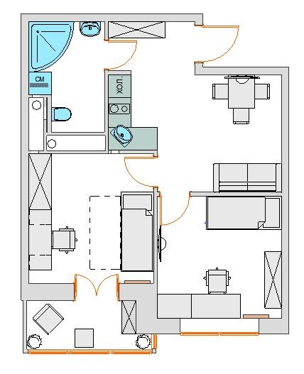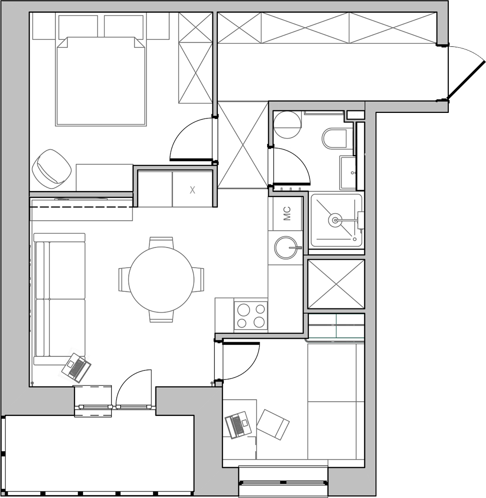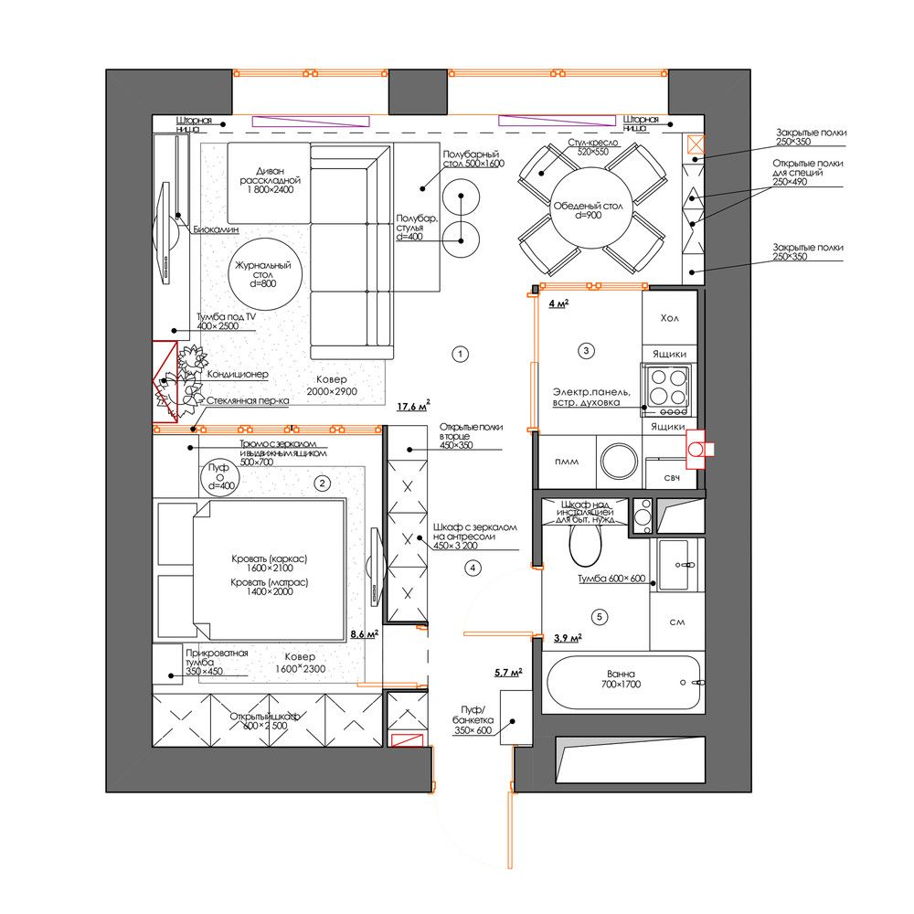 Для начала внимательно изучим план помещения: такой вариант перепланировки подойдет не только владельцам однокомнатных квартир в новостройке (в этом проекте площадь до перепланировки составляла 40 м²), но и собственникам небольших хрущевок. Правда, во втором случае необходимо будет тщательно все рассчитать.