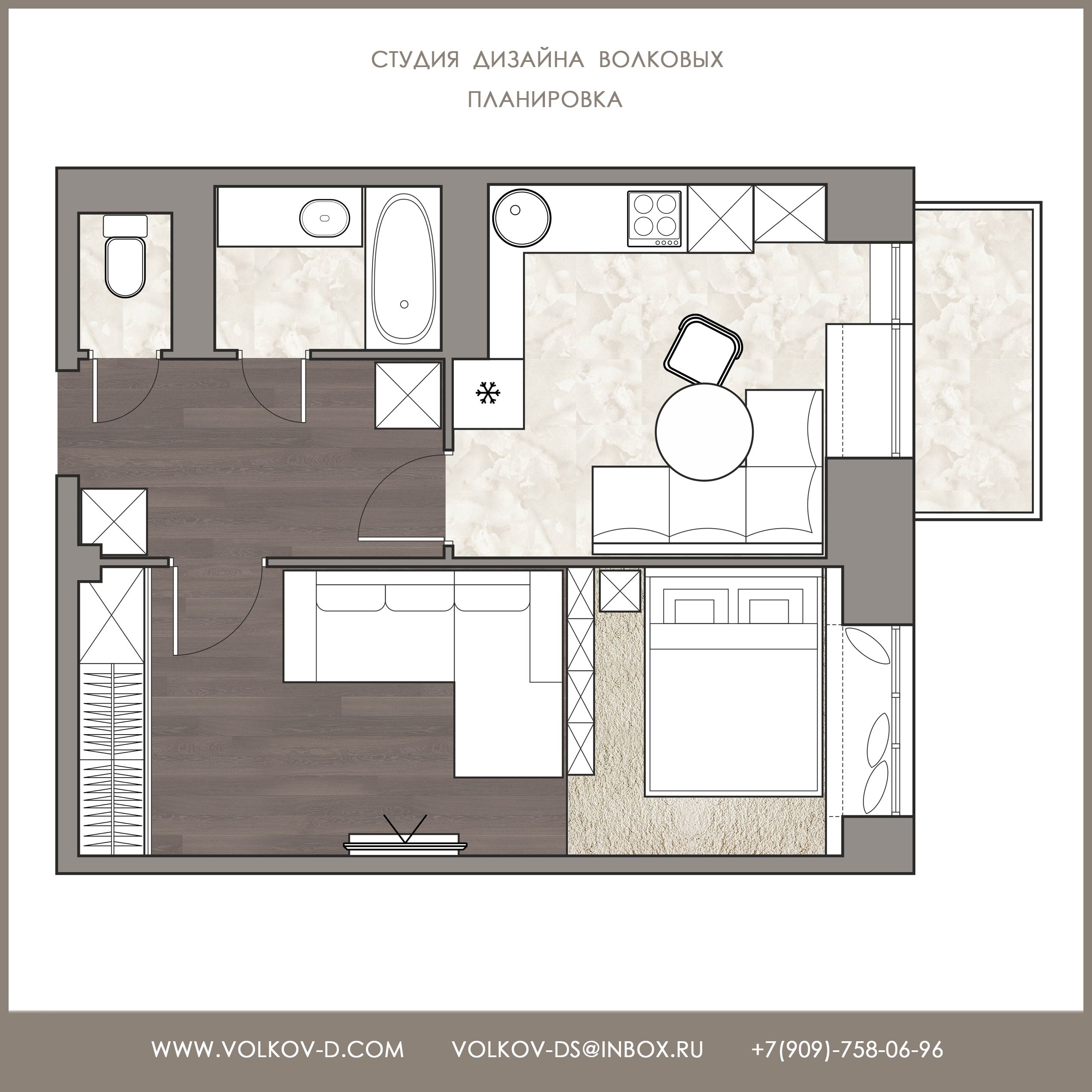 Вот и план квартиры, наглядно демонстрирующий, как из однушки сделать двушку. Возле спальни — вместительная гардеробная, в которой прячутся все вещи, в том числе и верхняя одежда. Благодаря этой комнате удалось не перегружать гостиную и спальню лишними деталями – комодами, полками и стеллажами, не говоря уже о шкафах, которые попросту некуда было бы поставить. 🙂