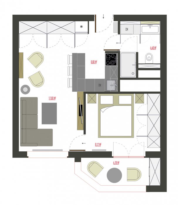 Грамотное планировочное решение позволяет оптимизировать пространство квартиры с созданием просторной кухни-гостиной и спальной зоны у окна, условное отделяемой плотными портьерами.