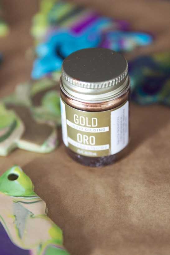 - Испекшиеся игрушки вытяните из духовки и дайте им остыть. Когда они остынут и станут комнатной температуры, покройте с помощью тонкой кисточки края ёлочных украшений позолотой, как показано на фото.