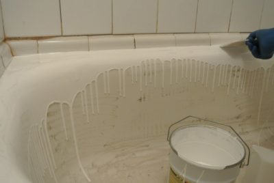 С поверхности новой эмалированной ванны натеки краски либо клея можно осторожно устранить при помощи острого лезвия. В то же время, действуя механическим способом, необходимо помнить, что чрезмерное нажатие может привести к повреждению верхнего глянцевого эмалированного слоя, на месте которого позднее появится пятнышко от въевшейся грязи и налета. При этом от небольших брызг плиточного клея прекрасно подойдет длительное воздействие горячей воды, нужно всего лишь наполнить ванну водой и оставить ее на несколько часов. Затем обработать следы от подтеков жесткой стороной стандартной губки для мытья посуды, состоящей из поролона, но ни в коем случае не используя ее металлический аналог.