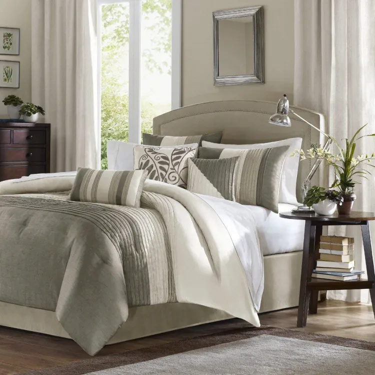9. В последнем ряду стоят европейские подушки (70×70), далее стандартные 50×70, а впереди немного к центру смещены прямоугольные декоративные.