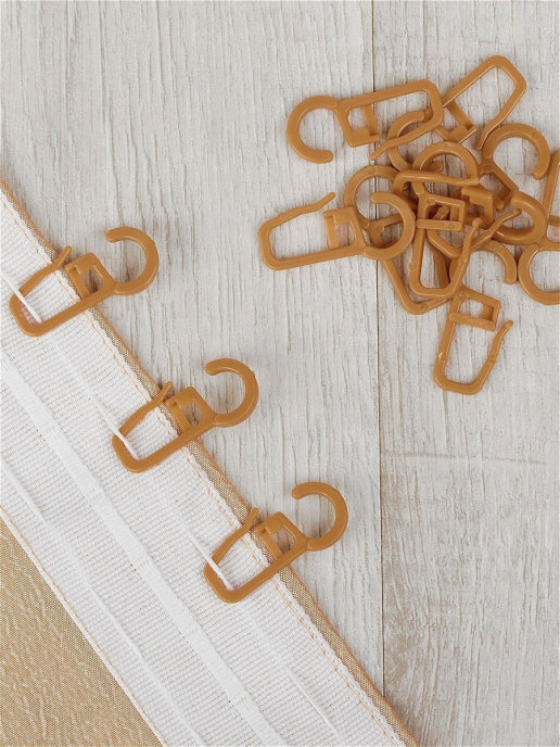 Повесить шторы можно на карниз с кольцами, которые должны прилагаться к покупке в комплекте с крючками. Отметим, что крючки могут использоваться отдельно либо в паре с колечками. Если штора вешается на крючки, то на нее следует пришить специальные петли, либо шторную ленту.