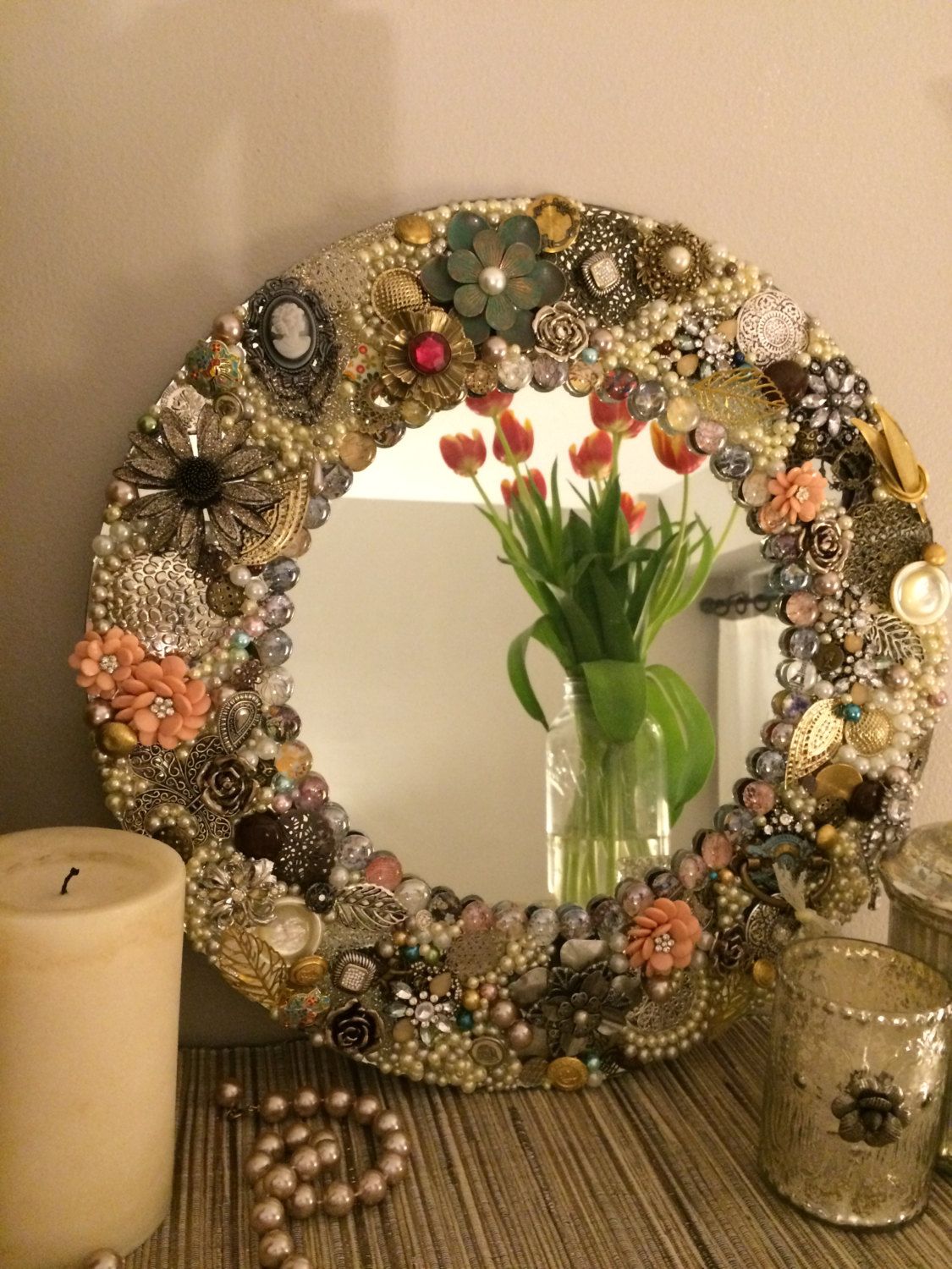 Отремонтировать старое зеркало можно при помощи различных декоративных элементов. Их можно приобрести в специализированных магазинах фурнитуры, а можно найти у себя в хозяйстве. Красиво декорировать можно как само зеркало, так и его раму. В качестве декоративных элементов могут выступать пуговицы, старая бижутерия, стразы, стеклярус, бисер и т.п.