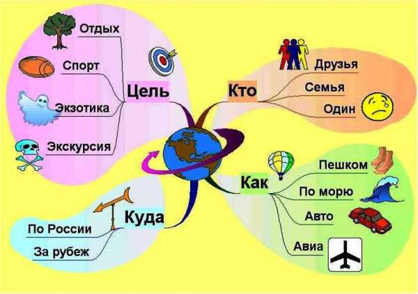 Рис. 1. Интеллект-карта «Путешествие»Чтобы читатель смог получить предварительные представления о методе, проиллюстрируем процесс составления интеллект-карты на примере представленной работы (рисунок 1). В центре листа бумаги, будущей интеллект-карты, располагается описываемый объект (тема, понятие, предмет и т.п.), представленный в образной форме — это центральный образ (в нашем случае это тема «Путешествие»). Он рождает многочисленным ассоциациям. От центрального образа расходятся ветки первого уровня, на которых записываются слова, ассоциирующиеся с ключевыми понятиями, раскрывающими центральный образ – это ключевые слова (КТО путешествует, КАК путешествует, КУДА поедет, ЦЕЛЬ путешествия). Они являются содержательной основой интеллект-карты. С каждым ключевым словом могут быть связаны ассоциации, которые на карте отображаются ветками второго уровня. Например, с ключевым словом КАК путешествовать, ассоциируются слова: пешком, по морю, на автомобиле, на самолёте, и т.п., – это слова ассоциации второго уровня, каждое из которых располагается на своём ответвлении. С вторичными ассоциациями могут быть связаны ассоциации третьего уровня и т.д. Каждому слову-ассоциации подбирается адекватный графический образ, который обогащает ассоциацию и способствует лучшему запоминанию содержания интеллект-карты. Таким образом смысловая нагрузка карты задаётся ключевыми словами и словами-ассоциациями от них, а структура – ключевыми ветками и ответвлениями от них. Чем больше адекватных слов-ассоциаций использовано в карте, тем глубже проработан центральный образ. Чем точнее изображены ключевые ветки и их ответвления, тем структурнее уложился в сознании человека материал.
