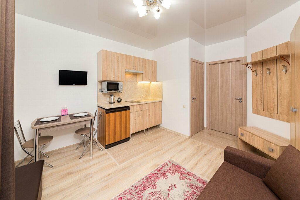 - Решите, что вам нужно: кровать и комод (если в шкафу недостаточно места).Кухонный стол с как минимум 2 стульями (4, если вы любите развлекаться).
