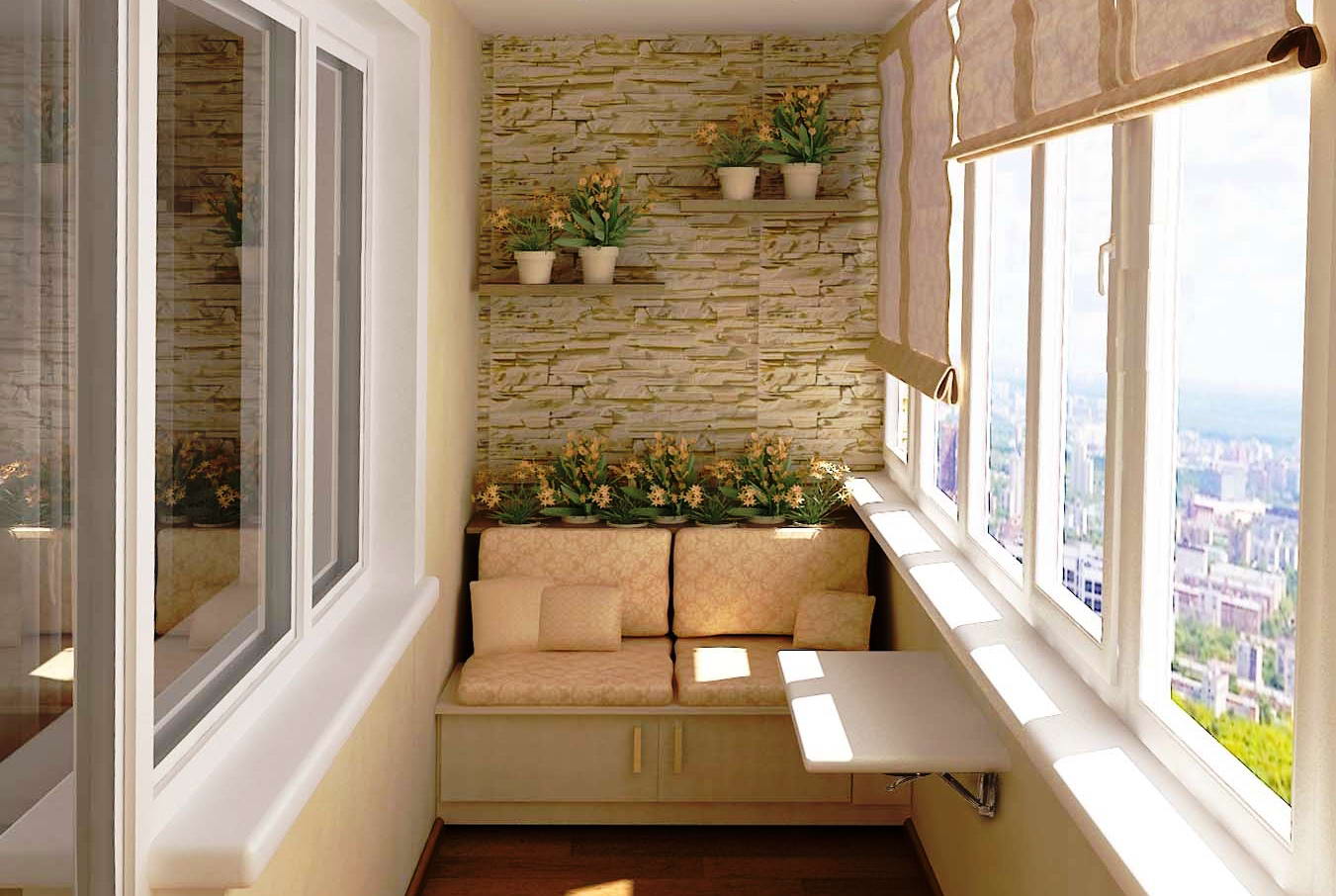 Вариант оформления лоджии декоративным камнемЕще одним вариантом простого и малозатратного обустройства балконов и лоджий служит отделка искусственным камнем, фото выше. Этот материал представлен в большом ассортименте: он имитирует кирпич, сланец, булыжник и др. По цвету может быть как природных тонов, так и окрашенным в любой оттенок. Декоративным камнем можно обшить все стены внутри лоджии или только часть, подчеркнув значимые зоны. Такое оформление вполне можно сделать своими руками, предварительно подготовив стены: выровняв их и нанеся проникающую грунтовку.