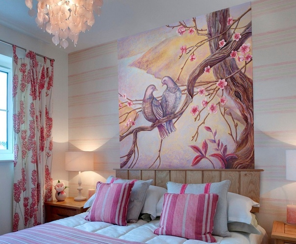 На картине может быть открытый светлый пейзаж с полевыми цветами (без деревьев), макрофото ветки сакуры или цветка. При этом должны доминировать успокаивающие мягкие цвета, сочетаемые с основной отделкой стен – розовый, пепельный, зеленый.