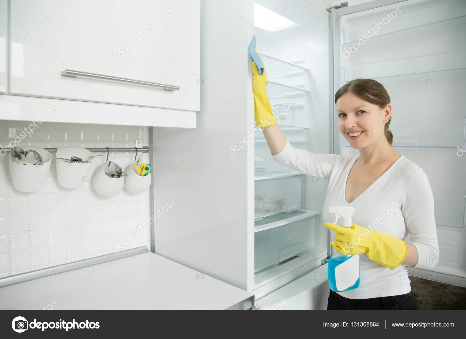 Когда ваш холодильник опустеет, выключится и вернется к комнатной температуре, наденьте хозяйственные перчатки, возьмите чистящий спрей и вперед!