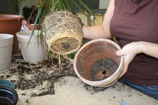 Чтобы убедиться окончательно в необходимости увеличить горшок, сделайте так. Накройте почву в горшке 3 ладонью (стволик или стволики растения пропустите сквозь пальцы) и, придерживая таким образом растение, переверните емкость. Осторожно постукивайте ею о край стола, пока не почувствуете, что ком земли вынимается из горшка. Осторожно выньте и посмотрите. Если земляной ком густо опутан корнями и земли почти не видно, то растение пора переселять в больший горшок. Если корни не полностью оплели ком, то растение в пересадке не нуждается. Верните его в прежний горшок тем же путем, каким вытащили. Не волнуйтесь, этим вы не причините ему никакого вреда.