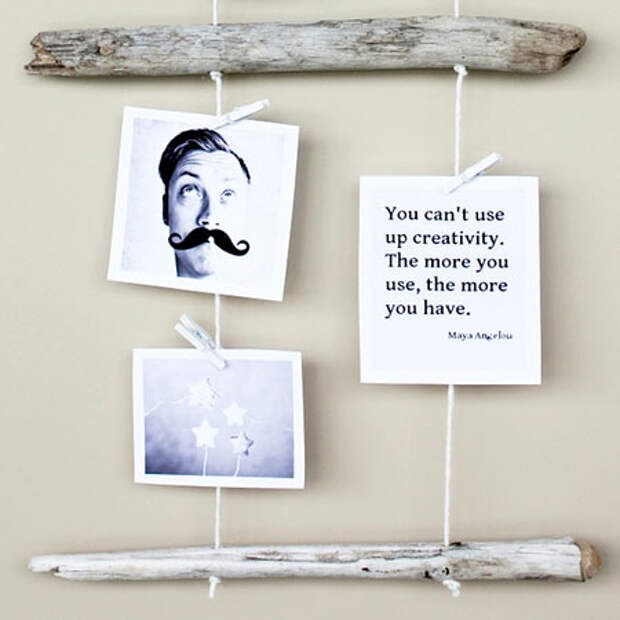 Суть заключается в том, что нужно закрепить кусок верёвки в горизонтальном или вертикальном положении относительно пола. Для этого идеально подойдёт клей и иголки. С помощью скрепок или иголок к нашему куску верёвки прикрепляются фотографии.