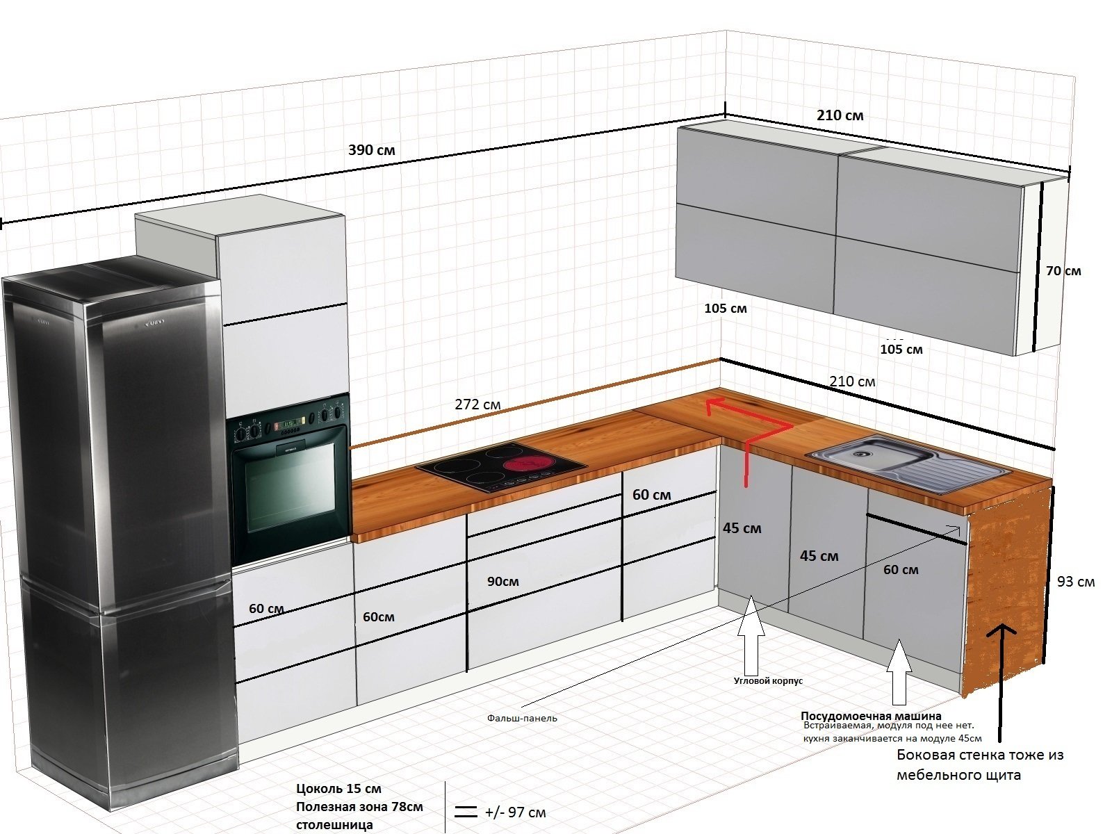 - Рабочая зона — столешница или рабочий стол, на котором мы с вами всё режем, шинкуем, чистим и рубим.