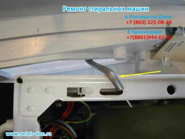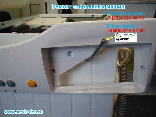 Следующую операцию выполняем при помощи сервисного крючка, он необходим для того чтобы повернуть панель стиральной машины на 180 градусов и перевести панель на боковую стенку.
