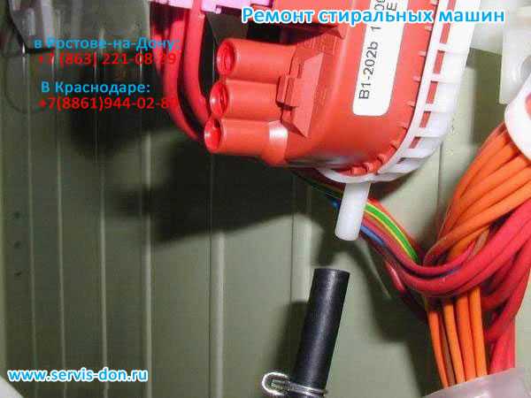 Предварительно ослабив плоскогубцами хомут на шланге идущий от емкости прессостата. Шланг идущий от прессостата отсоединяем и снимаем шланг с манжеты дверцы машины.