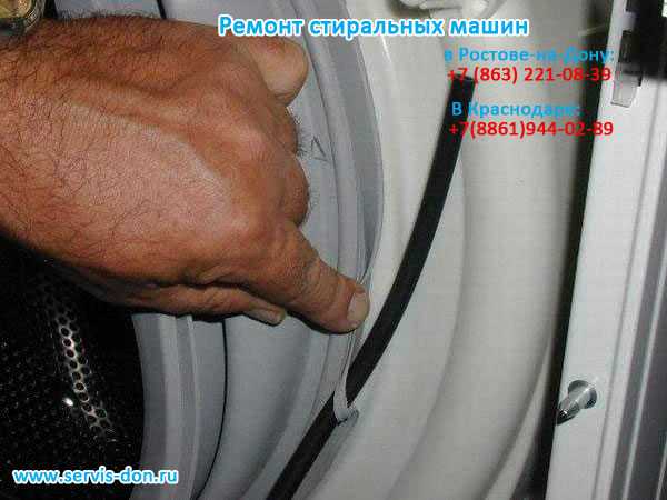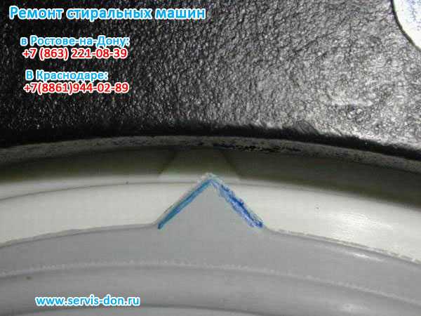 Также необходимо помнить о том, что при обратной сборке, манжету дверцы следует крепить так, чтобы вертикальная ось в стиральной машине обязательно совпадала со знаком (треугольника) Δ или (стрелочка) ↑ на манжете. Обязательно нужно убедится, что спускная канавка находится напротив от этого значка, но с противоположной стороны. Её расположение должно быть строго внизу манжеты.