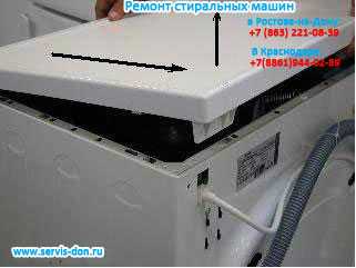 Поднимаем заднюю панели немного отжимая её от задней стенки, затем немного сдвигаем верхнюю крышку второй рукой к задней стенке, после чего она будет отцеплена от стиральной машины.